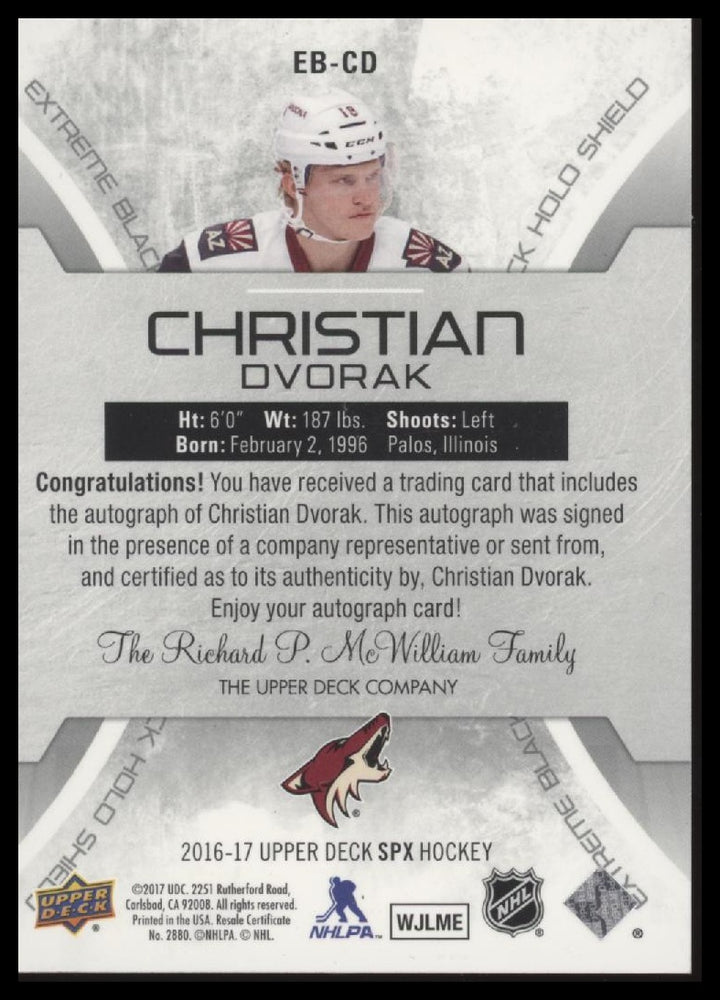 2016 SPX CHRISTIAN DVORAK EB-CD NRMT EXTREME BLACK HOLO SHIELD AUTOGRAPH COYOTES