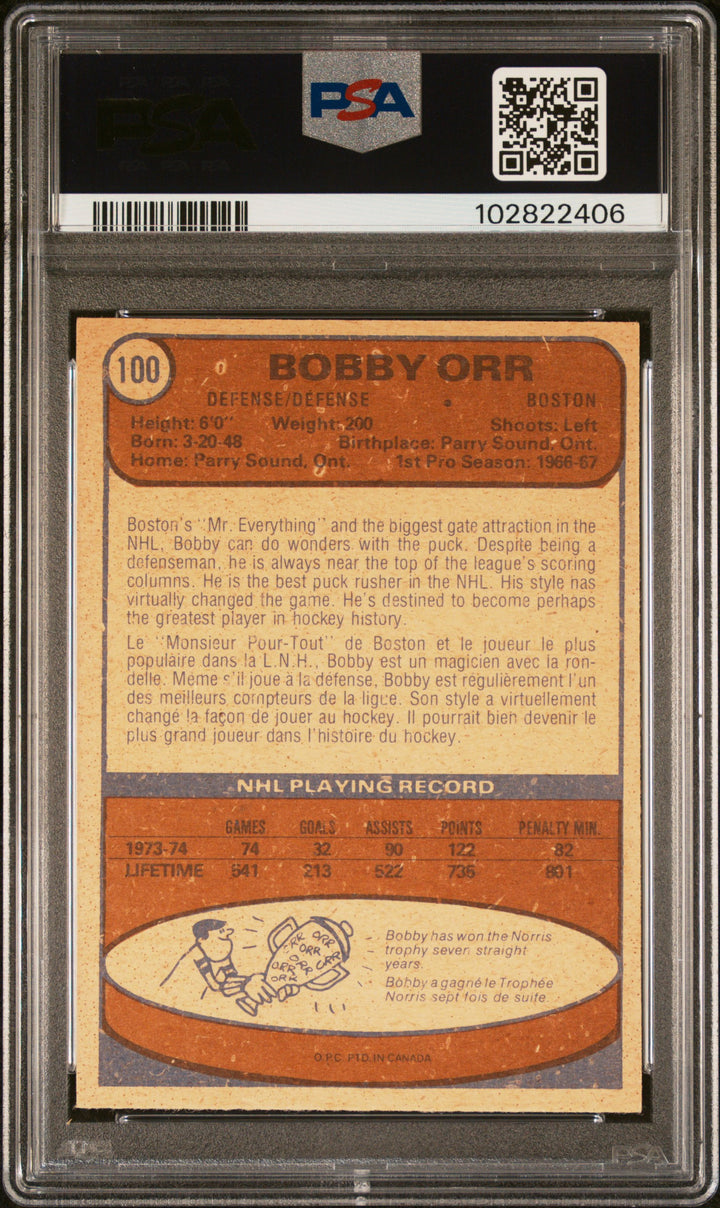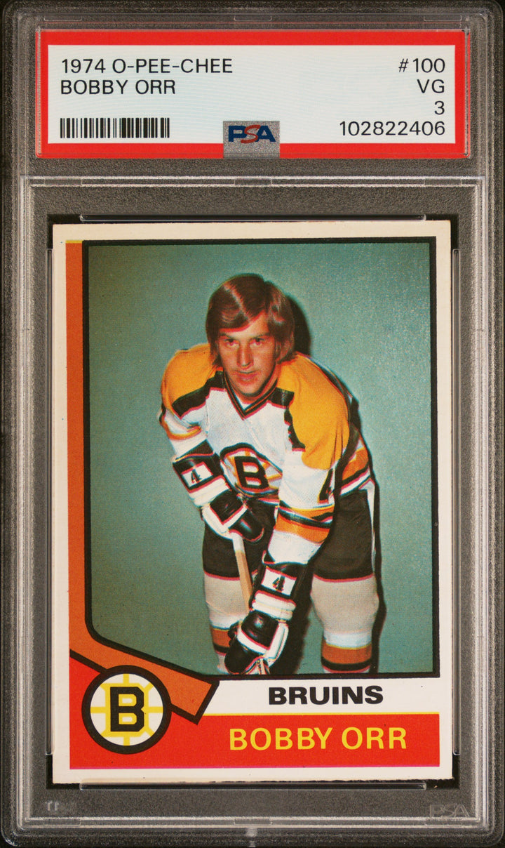 This BOBBY ORR, from the 1974 O-PEE-CHEE set, is in VG condition.