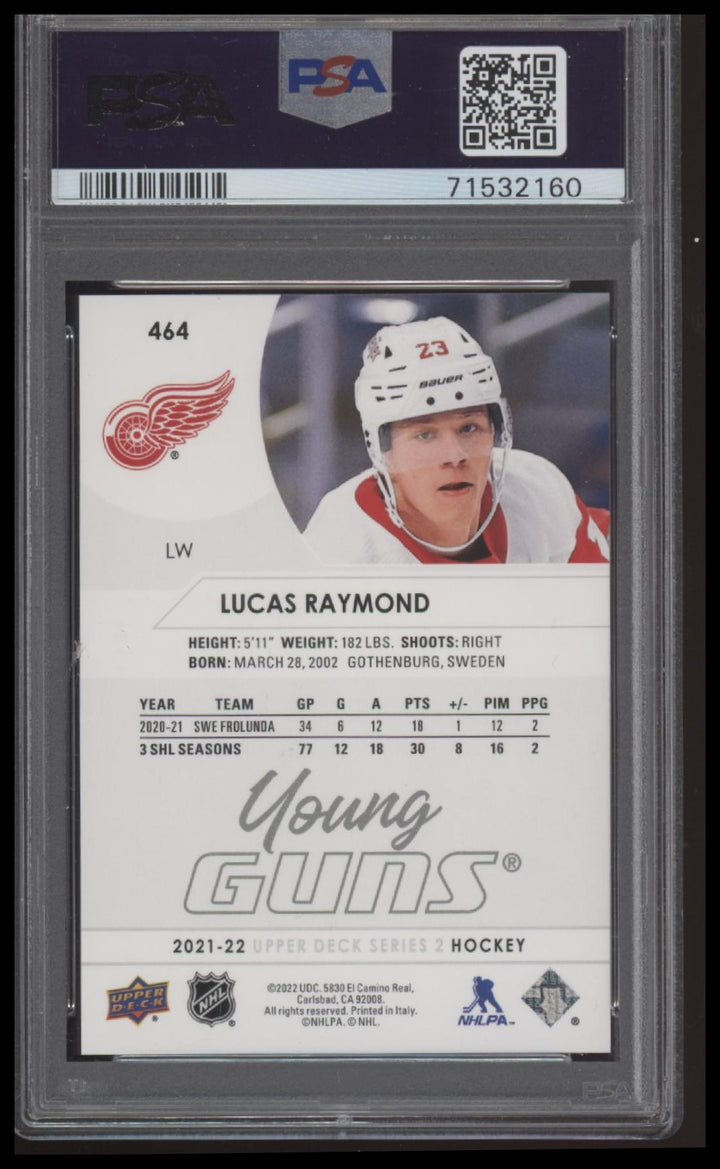 2021 UPPER DECK LUCAS RAYMOND 464 MINT RC YOUNG GUNS PSA 9 DETROIT RED WINGS