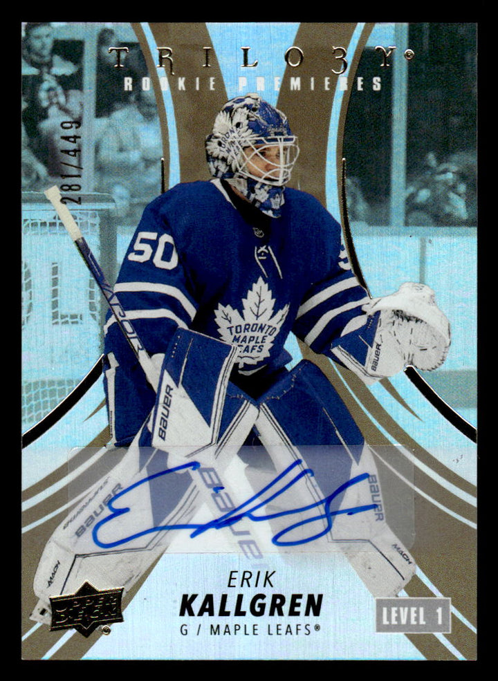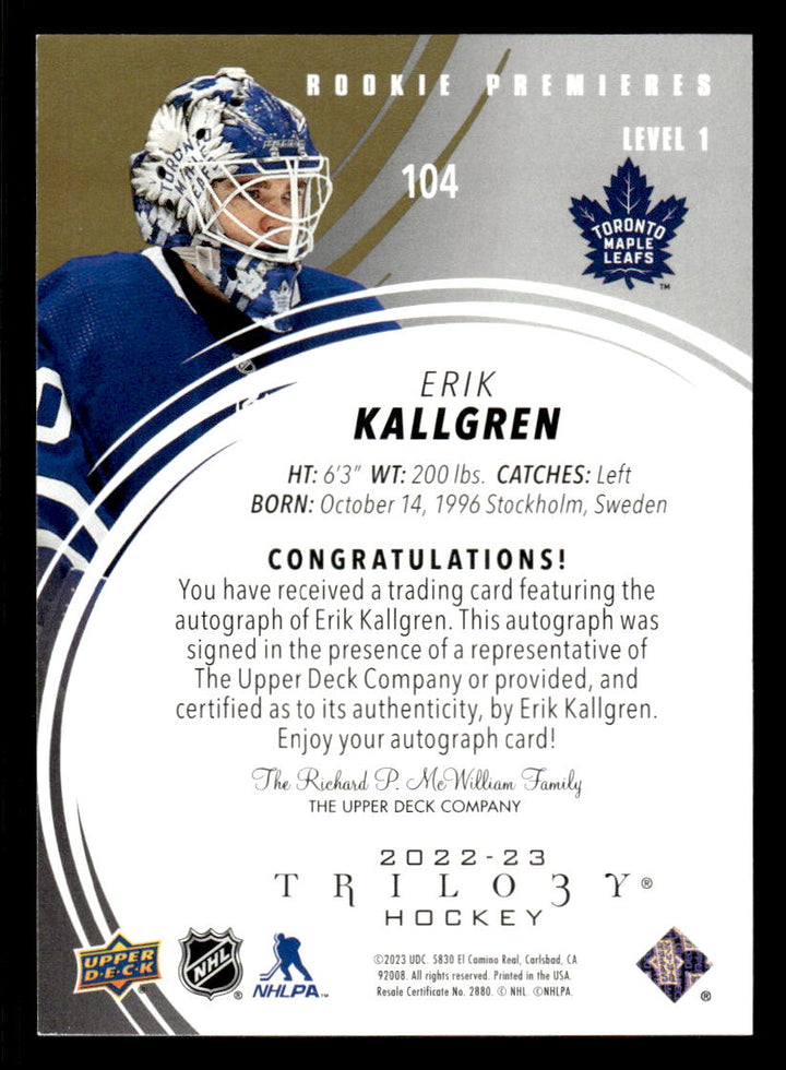 2022 UPPER DECK TRILOGY ERIK KALLGREN 104 GOLD AUTOGRAPHS RC 281/449 MAPLE LEAFS