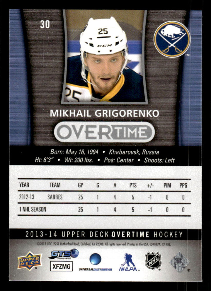 2013 UPPER DECK OVERTIME MIKHAIL GRIGORENKO 30 MINT HOCKEY BUFFALO SABRES