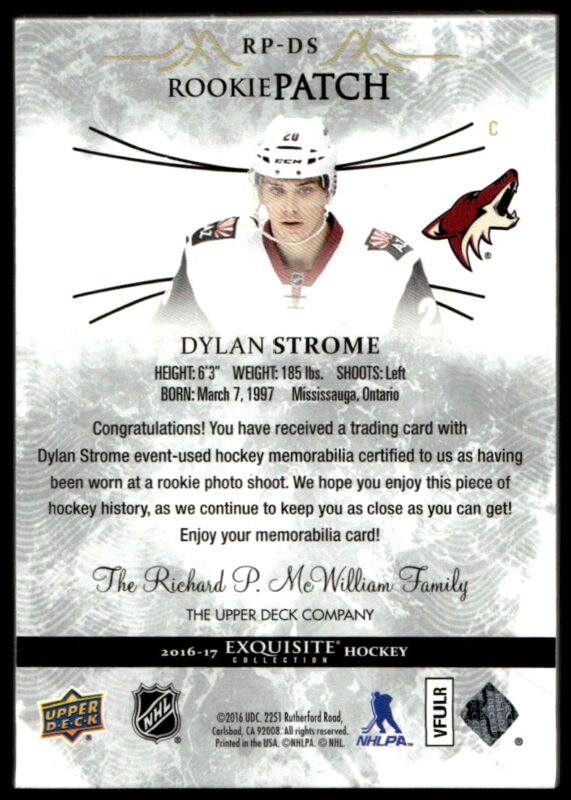 2016 UD BLACK DIAMOND DYLAN STROME RP-DS EXQUISITE ROOKIE PATCH 34/299 COYOTES