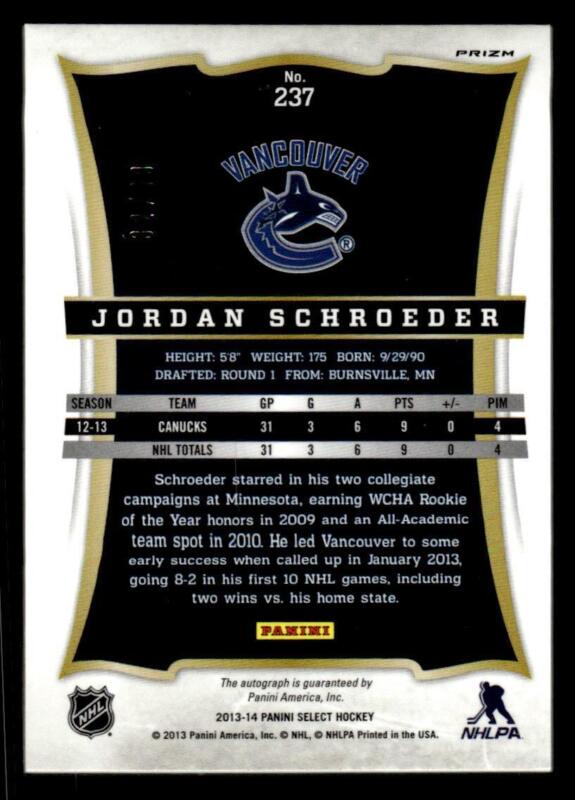 2013 PANINI SELECT JORDAN SCHROEDER 237 RC AUTOGRAPH PRIZMS 32/99 CANUCKS