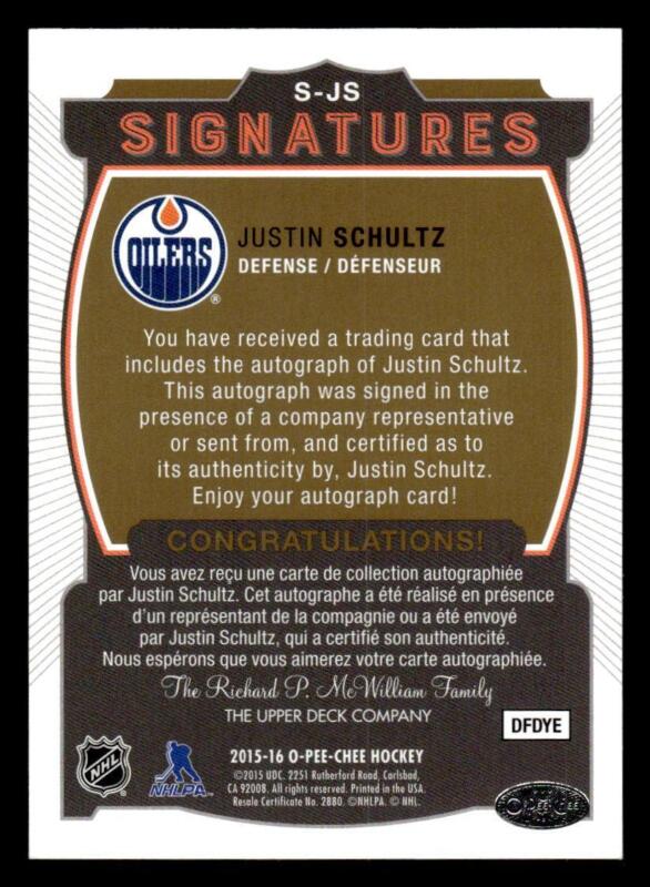 2015 O-PEE-CHEE JUSTIN SCHULTZ S-JS MINT SIGNATURES AUTOGRAPH EDMONTON OILERS