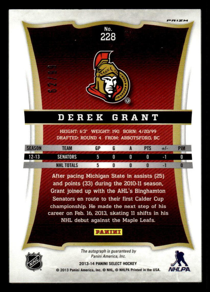 2013 PANINI SELECT DEREK GRANT 228 NRMT-MT PRIZM RC AUTOGRAPH 62/99 SENATORS