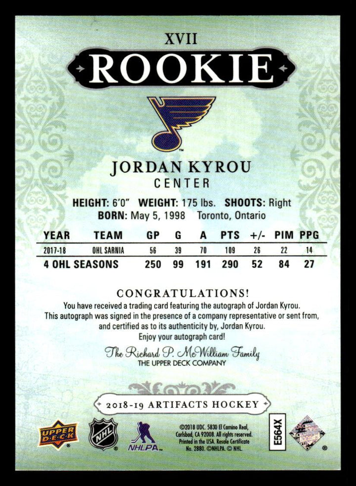2018 UD ARTIFACTS JORDAN KYROU XVII ROOKIE AUTOGRAPH EXCHANGE 88/175 BLUES