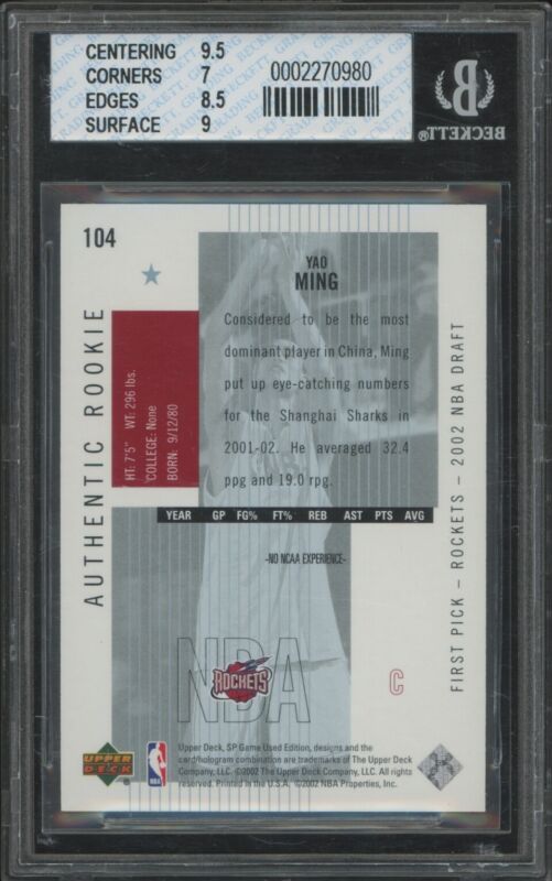 2002 SP GAME USED YAO MING 104 NRMT+ RC 130/900 BGS 7.5 HOUSTON ROCKETS