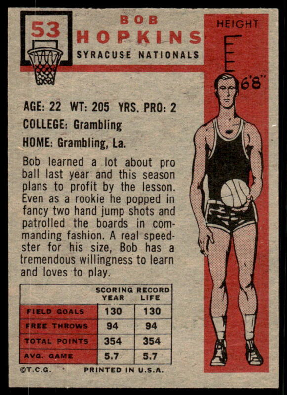 1957 TOPPS BOB HOPKINS 53 EXMT RC BASKETBALL SYRACUSE NATIONALS