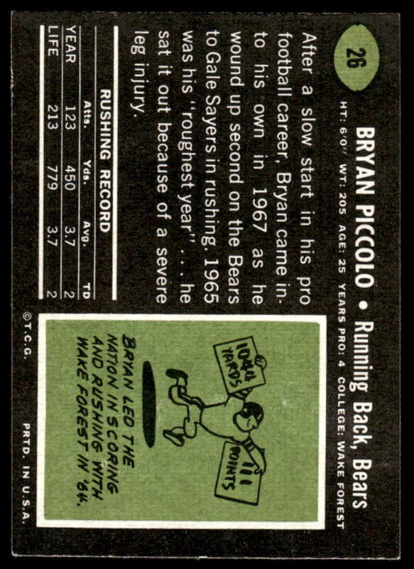 1969 TOPPS BRIAN PICCOLO 26 EX RC FOOTBALL CHICAGO BEARS