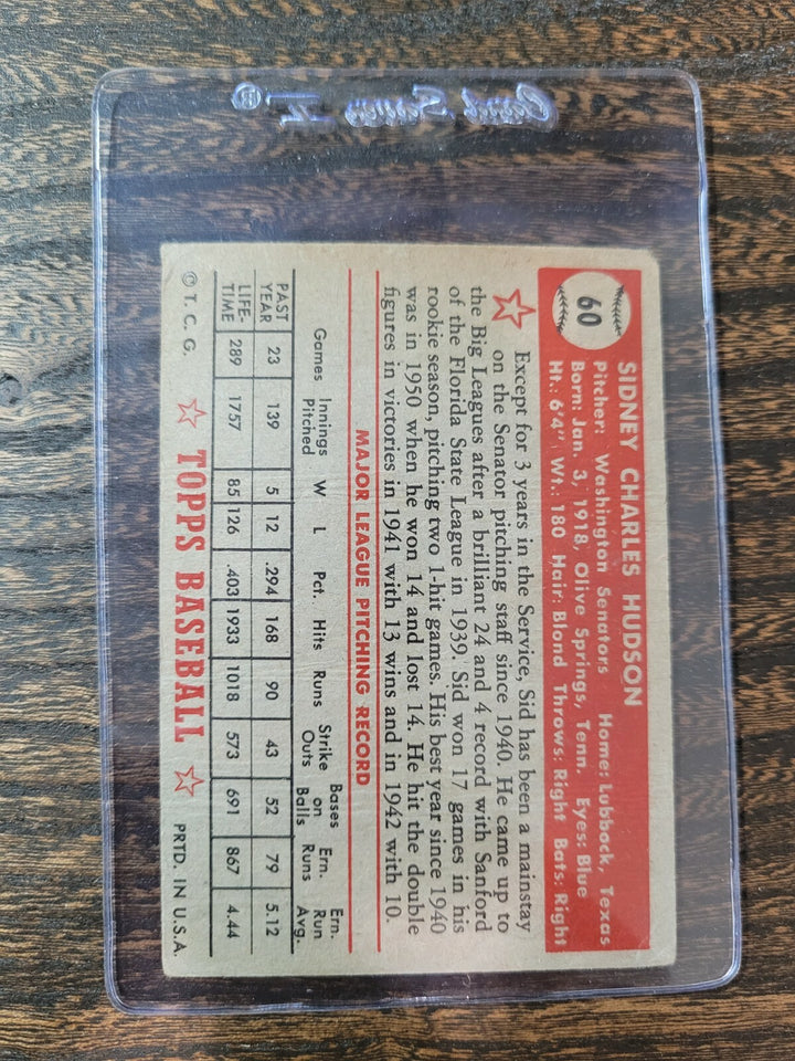 1952 TOPPS SID HUDSON 60 RED BACK BASEBALL WASHINGTON SENATORS