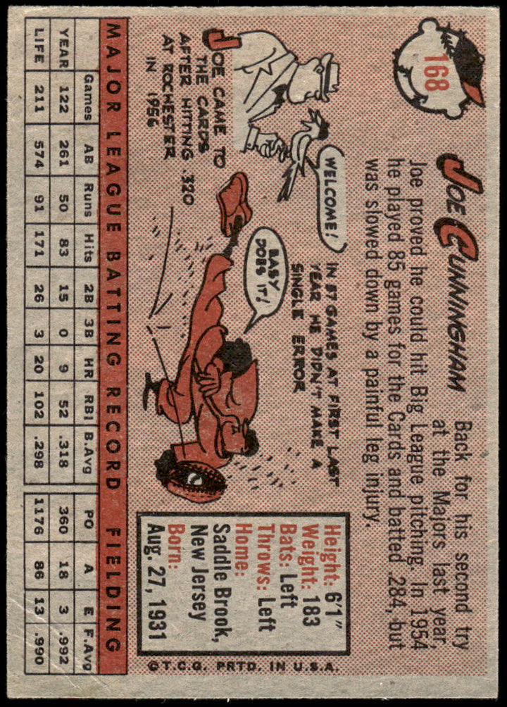 1958 TOPPS JOE CUNNINGHAM 168 EXMT BASEBALL ST. LOUIS CARDINALS