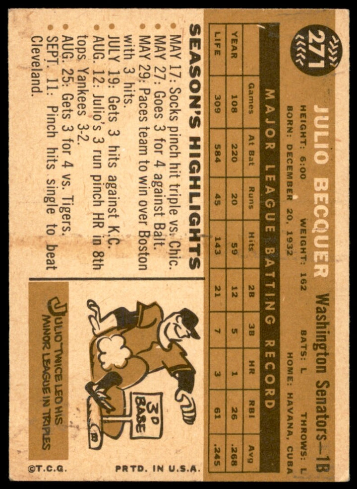 1960 TOPPS JULIO BECQUER 271 EX BASEBALL WASHINGTON SENATORS