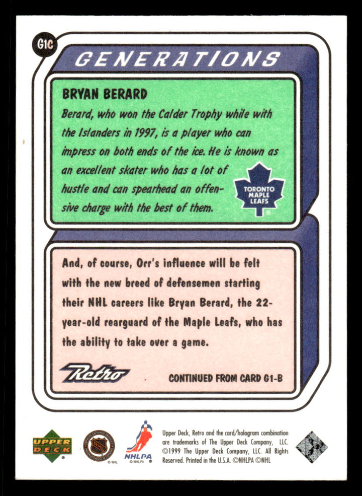 1999 UPPER DECK RETRO BRYAN BERARD G1C MINT GENERATION HOCKEY TORONTO MAPLE LEAF