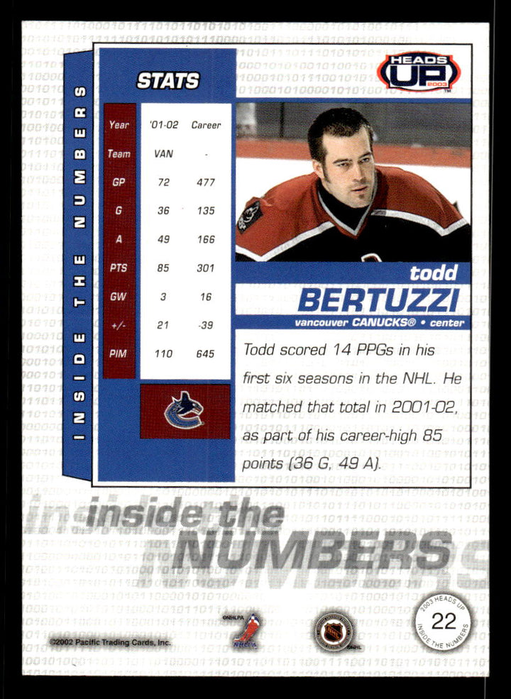 2002 PACIFIC HEADS TODD BERTUZZI 22 MINT INSIDE NUMBERS HOCKEY VANCOUVER CANUCKS