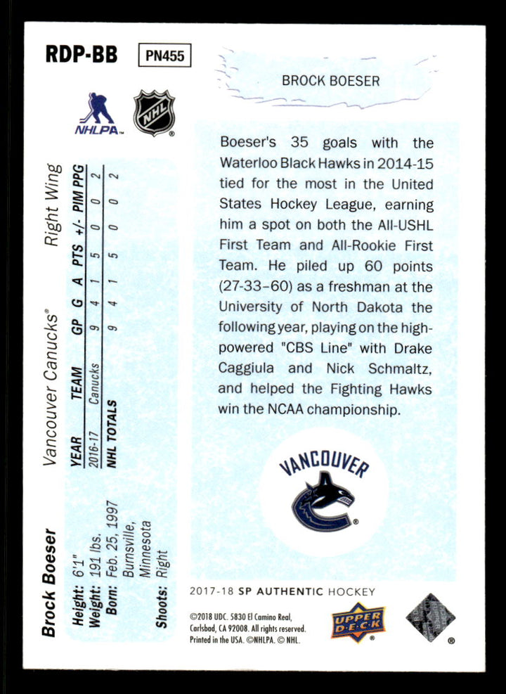 2017 SP AUTHENTIC BROCK BOESER RDP-BB MINT RETRO DRAFT HOCKEY VANCOUVER CANUCKS