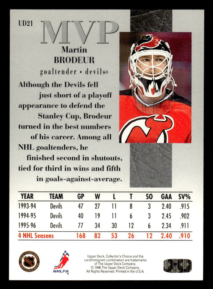 1996 COLLECTORS CHOICE MARTIN BRODEUR UD21 MINT MVP HOCKEY NEW JERSEY DEVILS