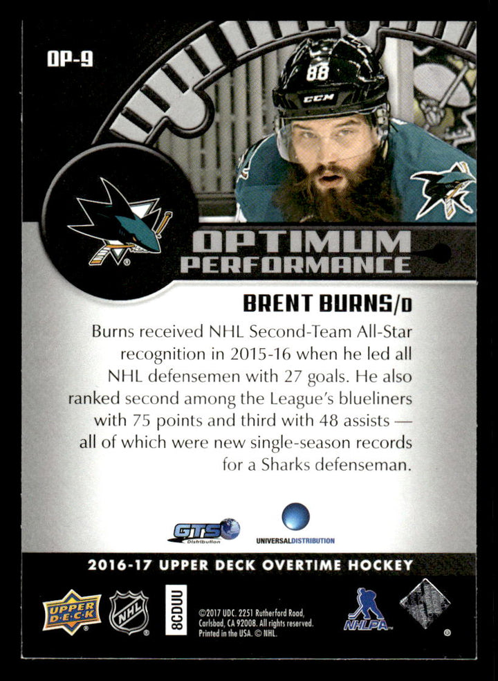 2016 UPPER DECK OVERTIME BRENT BURNS OP-9 MINT PERFORMANCE HOCKEY SAN JOSE SHARK
