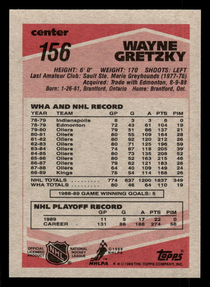 1989 TOPPS WAYNE GRETZKY 156 MINT HOCKEY LOS ANGELES KINGS