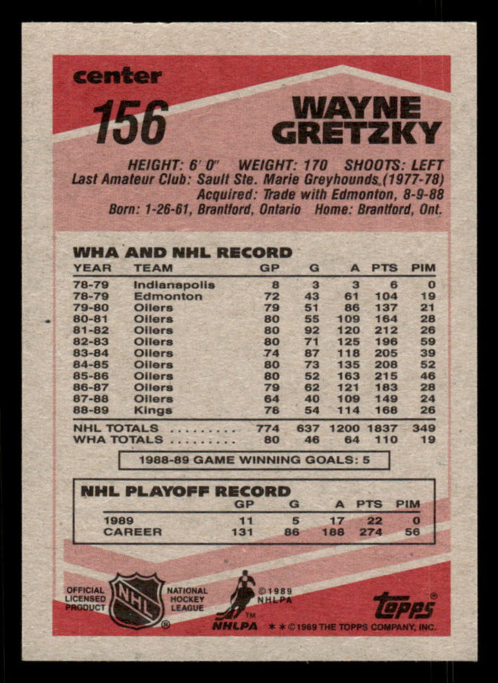 1989 TOPPS WAYNE GRETZKY 156 MINT HOCKEY LOS ANGELES KINGS