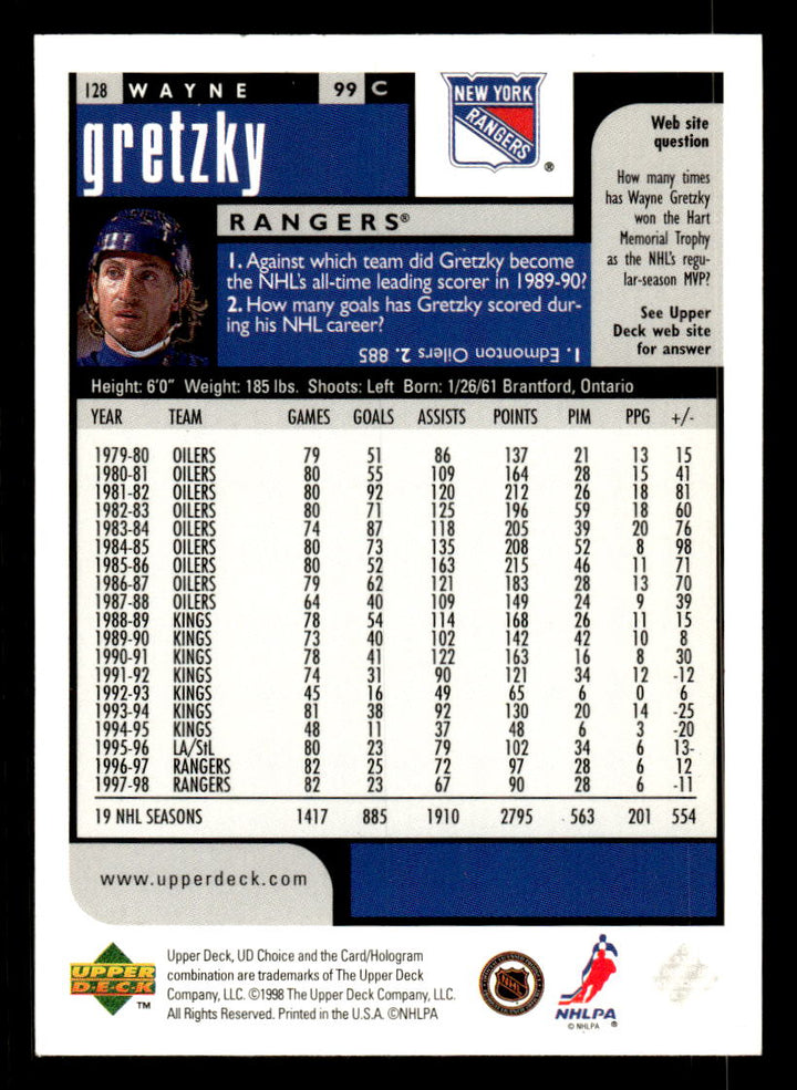 1998 UD CHOICE WAYNE GRETZKY 128 MINT HOCKEY NEW YORK RANGERS