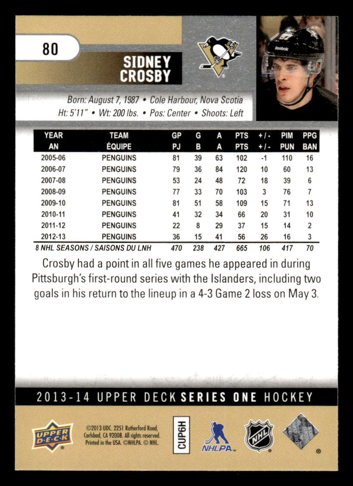 2013 UPPER DECK SIDNEY CROSBY 80 MINT HOCKEY PITTSBURGH PENGUINS