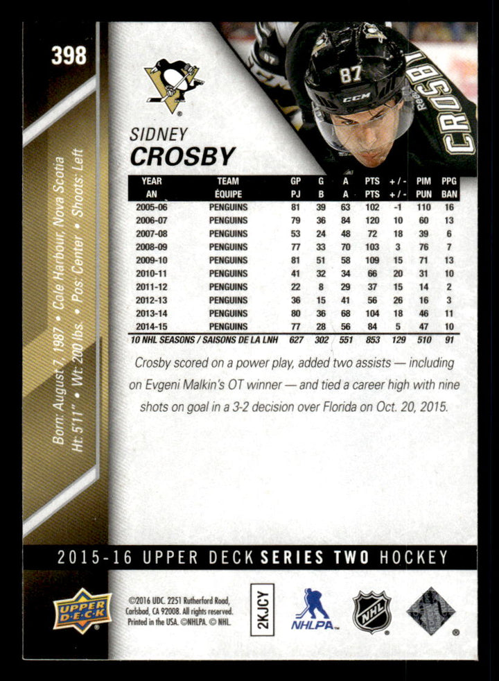2015 UPPER DECK SIDNEY CROSBY 398 MINT HOCKEY PITTSBURGH PENGUINS