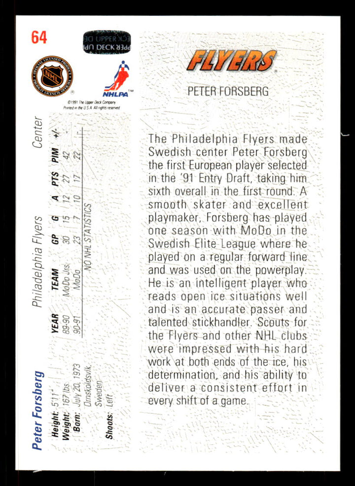 1991 UPPER DECK PETER FORSBERG 64 MINT RC HOCKEY PHILADELPHIA FLYERS