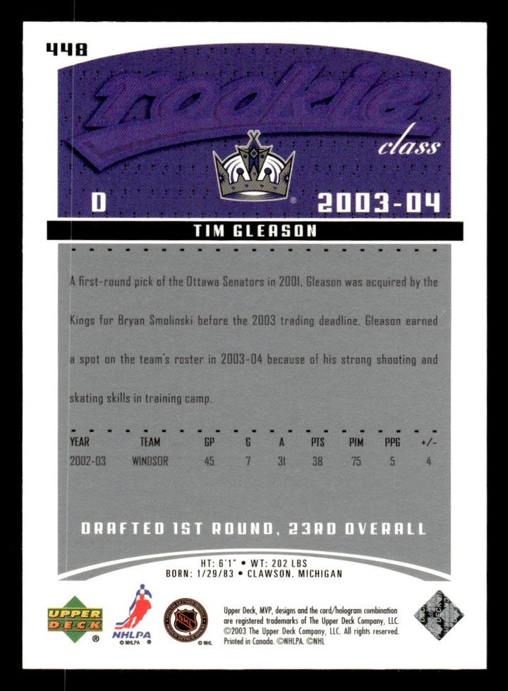 2003 UPPER DECK MVP TIM GLEASON 448 MINT RC HOCKEY LOS ANGELES KINGS