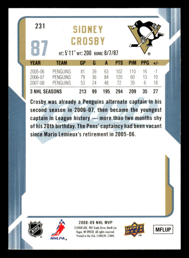 2008 UPPER DECK MVP SIDNEY CROSBY 231 MINT HOCKEY PITTSBURGH PENGUINS