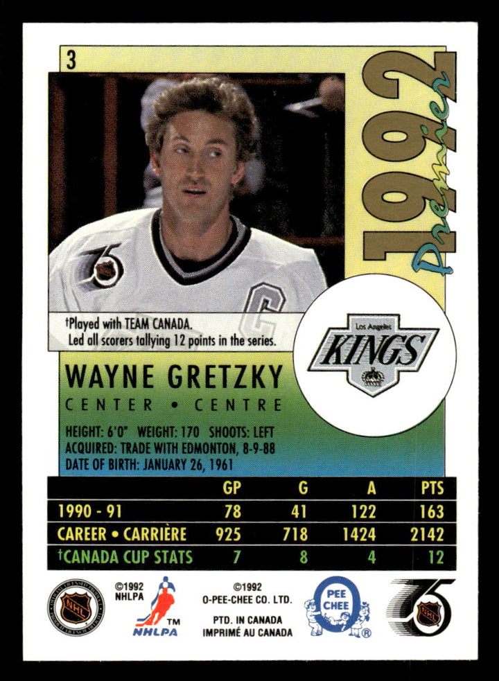 1991 O-PEE-CHEE PREMIER WAYNE GRETZKY 3 MINT HOCKEY LOS ANGELES KINGS