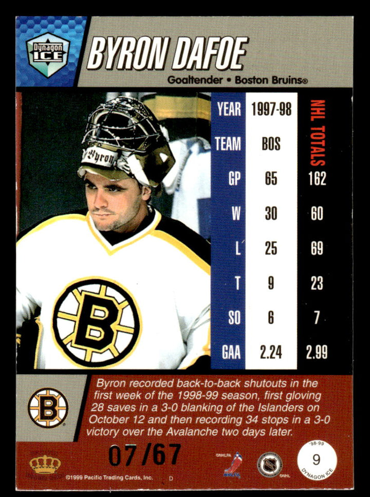 1998 PACIFIC DYNAGON ICE BYRON DAFOE 9 MINT BLUE 7/67 HOCKEY BOSTON BRUINS