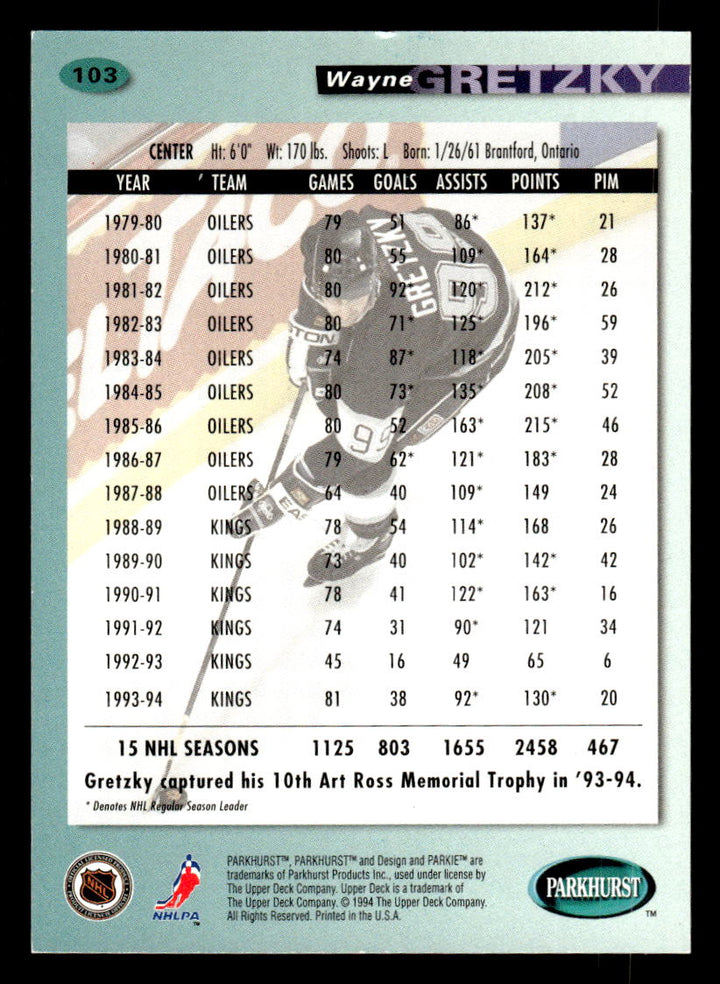 1994 PARKHURST WAYNE GRETZKY 103 MINT PARKIE GOLD HOCKEY LOS ANGELES KINGS