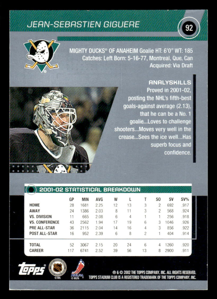 2002 STADIUM CLUB JEAN-SEBASTIEN GIGUERE 92 MINT SILVER DECOY MIGHTY DUCKS