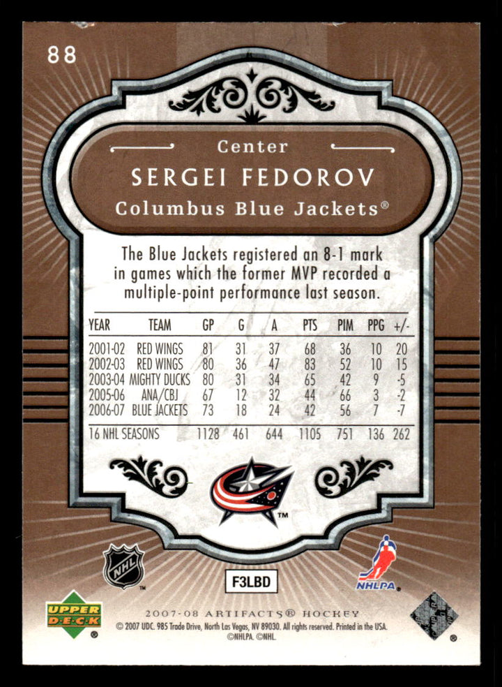 2007 UPPER DECK ARTIFACTS SERGEI FEDOROV 88 MINT HOCKEY COLUMBUS BLUE JACKETS