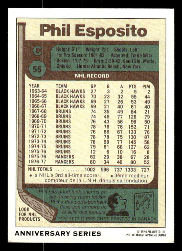 1992 O-PEE-CHEE PHIL ESPOSITO 10 MINT 25TH ANNIVERSARY HOCKEY NEW YORK RANGERS