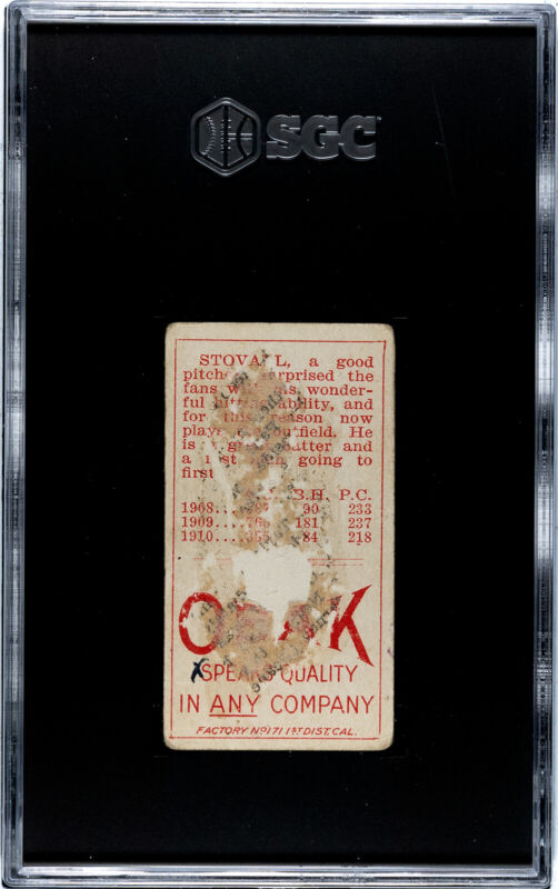 1909 T212 JESSE STOVALL NNO POOR OBAK SGC 1 BASEBALL PORTLAND PIPPINS