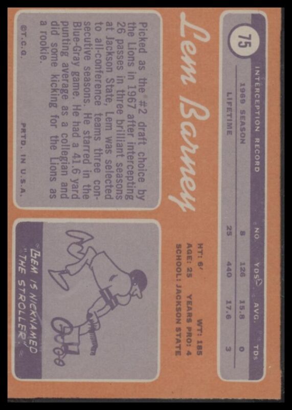 1970 TOPPS LEM BARNEY 75 NRMT-MT RC SGC 8 FOOTBALL DETROIT LIONS