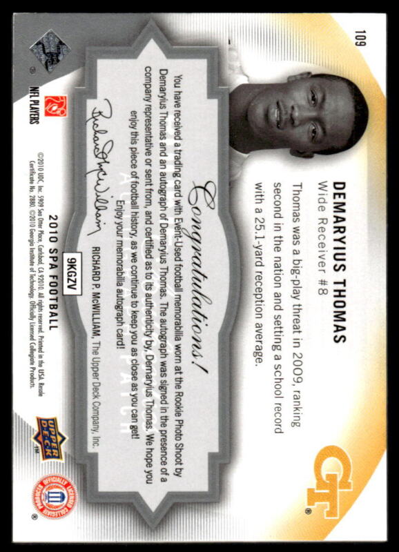2010 SP AUTHENTIC DEMARYIUS THOMAS 109 RPA RC PATCH AUTOGRAPH /199 GEORGIA TECH