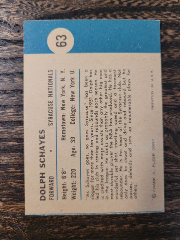 1961 FLEER DOLPH SCHAYES 63 VG+ CENTERED BASKETBALL SYRACUSE NATIONALS