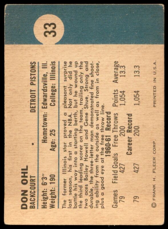 1961 FLEER DON OHL 33 VG-EX RC BASKETBALL DETROIT PISTONS