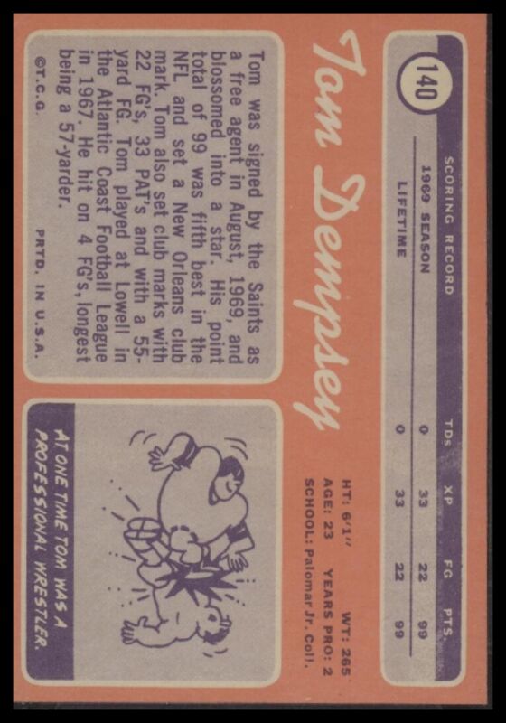 This TOM DEMPSEY, from the 1970 TOPPS set, is in NRMT-MT condition.