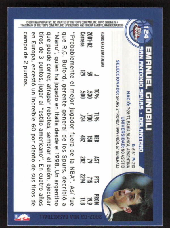2002 TOPPS CHROME EMANUEL GINOBILI 124 RC MANU SPANISH BACK SAN ANTONIO SPURS