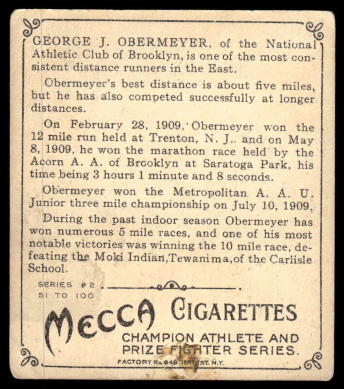 1910 T218 GEORGE OBERMEYER VG HASSAN TRACK FIELD NATIONAL ATHLETIC CLUB BROOKLYN