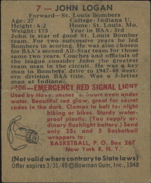 1948 BOWMAN JOHN LOGAN 7 FAIR BASKETBALL ST. LOUIS BOMBERS