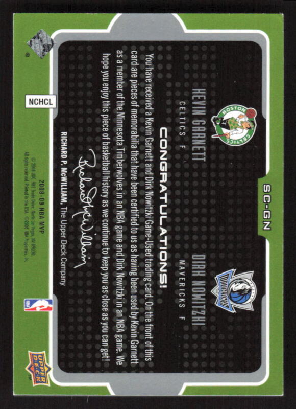 2008 UPPER DECK MVP KEVIN GARNETT SC-GN MINT DIRK NOWITZKI STAR COMBOS JERSEY