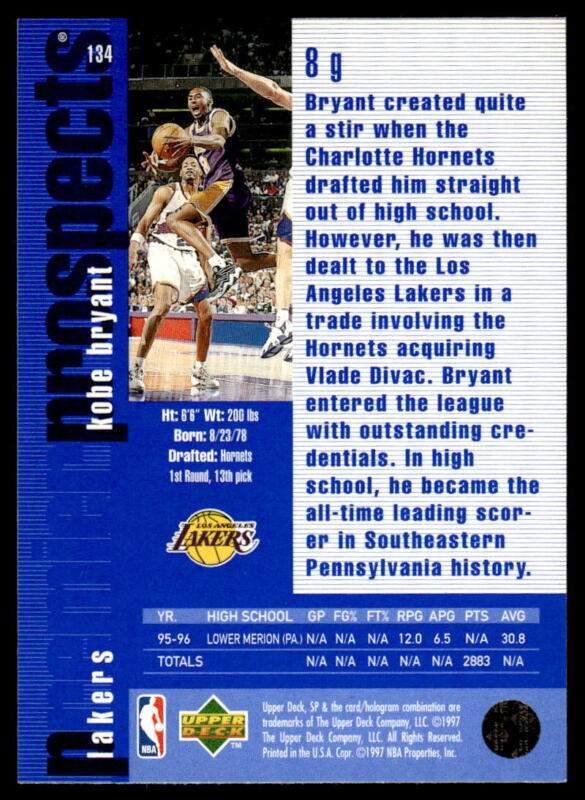 1996 SP KOBE BRYANT 134 NRMT HOF RC BASKETBALL LOS ANGELES LAKERS