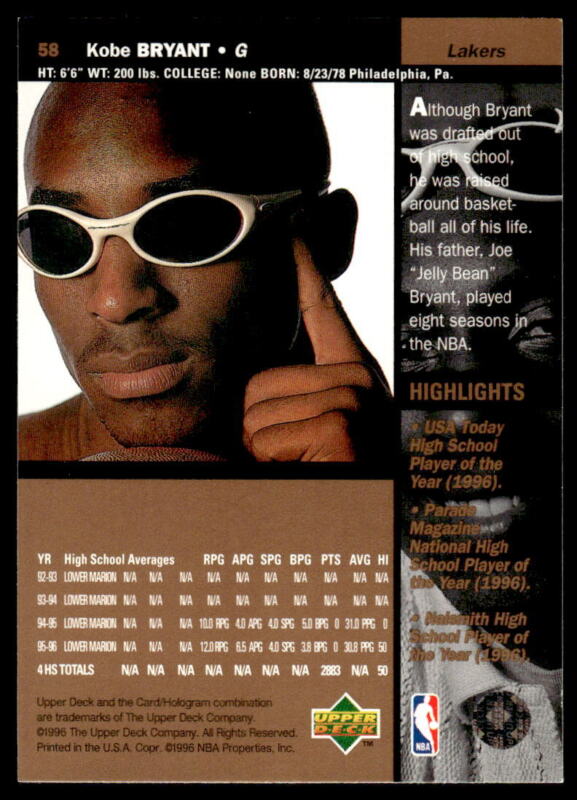 1996 UPPER DECK KOBE BRYANT 58 MINT RC BASKETBALL LOS ANGELES LAKERS