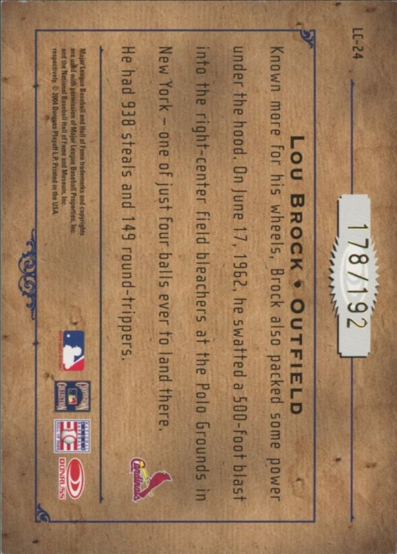 This LOU BROCK, from the 2004 DONRUSS LEATHER & LUMBER set, is in MINT condition.