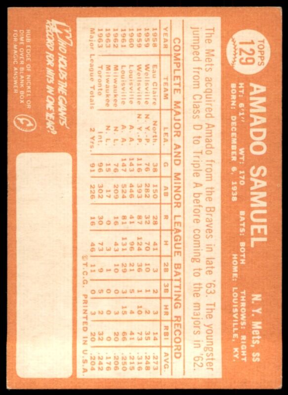 1964 TOPPS AMADO SAMUEL 129 EXMT BASEBALL NEW YORK METS