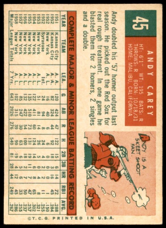 1959 TOPPS ANDY CAREY 45 EX BASEBALL NEW YORK YANKEES